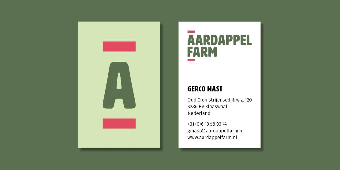 De Aardappelfarm bestaat al enige jaren en ze waren toe aan een professionaliseringsslag qua huisstijl. Het bedrijf teelt verschillende soorten delicatesse aardappelen, waarbij het gaat om kwaliteit en smaak. Deze teler opereert in het hogere segment in een echte nichemarkt. Ik kreeg de opdracht de visual identity te ontwikkelen, met de kernwoorden: modern, van nu, fris. Waarbij groen, duurzaamheid en de voeten in de klei ook zeker van belang was.