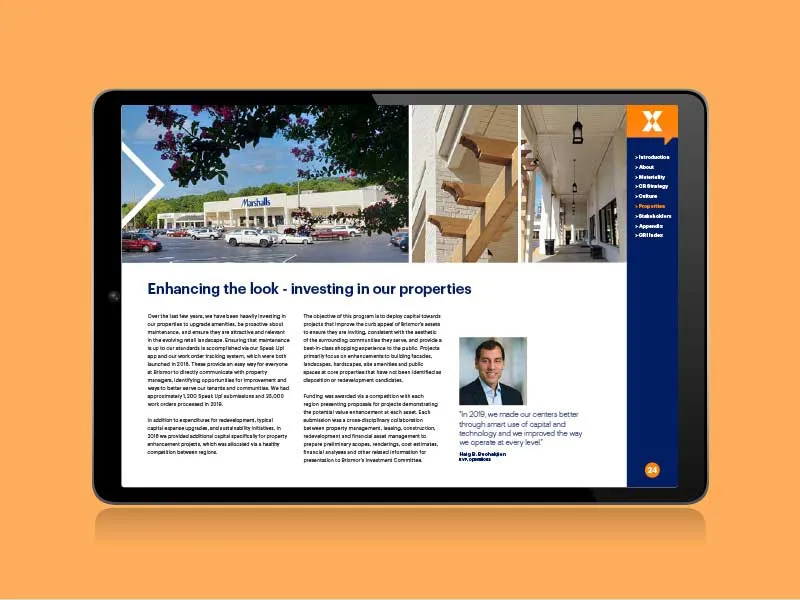 Voor Brixmor heb ik een Corporate Responsibility Report ontworpen, met alles dat ze moeten communiceren volgens de richtlijnen van GRESB (Global Real Estate Sustainability Benchmark). Het is ontworpen volgens de huisstijlrichtlijnen van het Amerikaanse bedrijf.