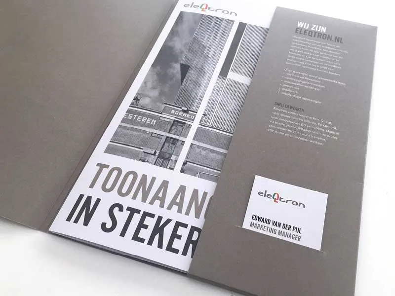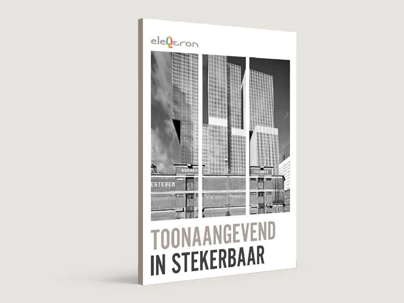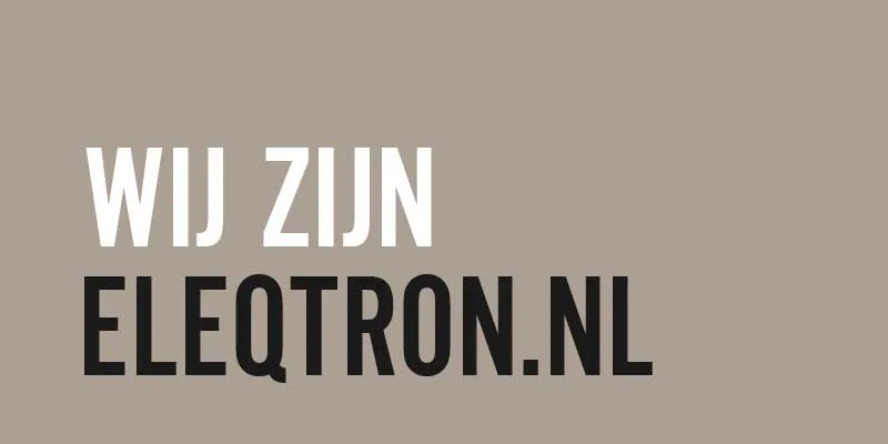 Met een paar kleine aanpassingen in de logo’s van de merken, maar vooral door consequent te zijn, heb ik een huisstijl ontwikkeld die past bij het bedrijf. Door de kleur van de letters uit het logo van Eleqtron te nemen als hoofdkleur, voor zowel Eleqtron als de merken, vormt zich al een stevige basis. De grote letters zijn typerend voor de communicatiestijl en we gebruiken veel grote sprekende (zwart wit) foto’s.