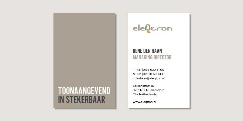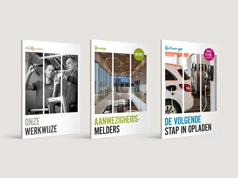 Eleqtron is een bedrijf dat al ruim 30 jaar bestaat en in de loop van de jaren waren er vele uitingen gemaakt, maar het miste een consequente uitstraling. Ik ben gevraagd een identity te ontwikkelen die past bij het bestaande logo en past bij de logo’s van de merken Qneqt en Qcharge.