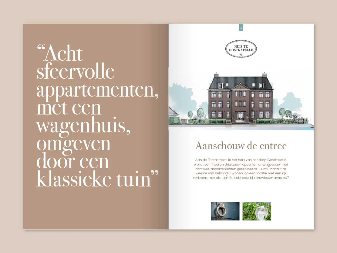 In het Zeeuwse Oostkapelle bouwt Estuarium Vastgoed 8 luxe, klassieke en duurzame appartementen. Met de bouw van ‘Huis te Oostkapelle’ op deze locatie, wordt een stukje Oostkapelse historie nieuw leven ingeblazen. Vanzelfsprekend in een eigentijdse vorm, maar met de allure en grandeur van ver vervlogen tijden; 18e eeuwse grandeur in een nieuw jasje. Voor dit nieuwbouwproject heb ik een bijpassend logo en concept ontwikkeld, dat allemaal samenkomt in een luxe boek.