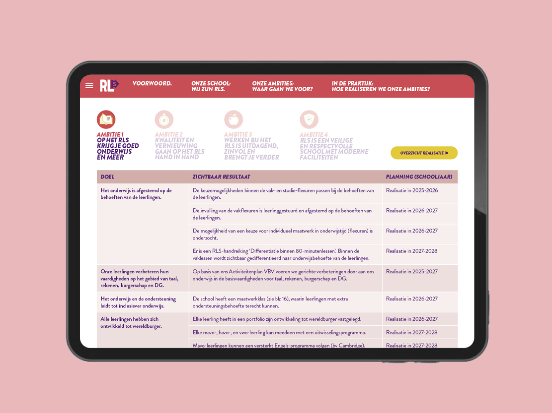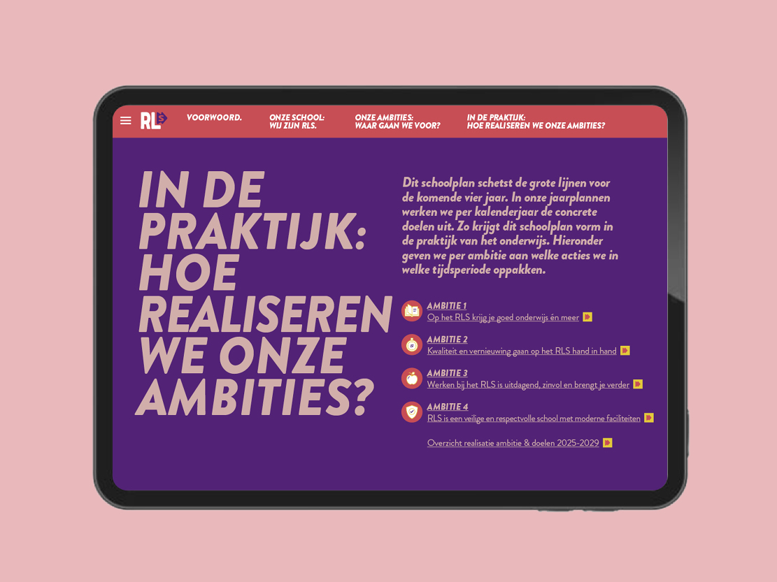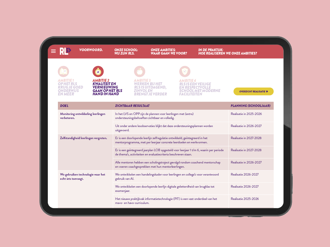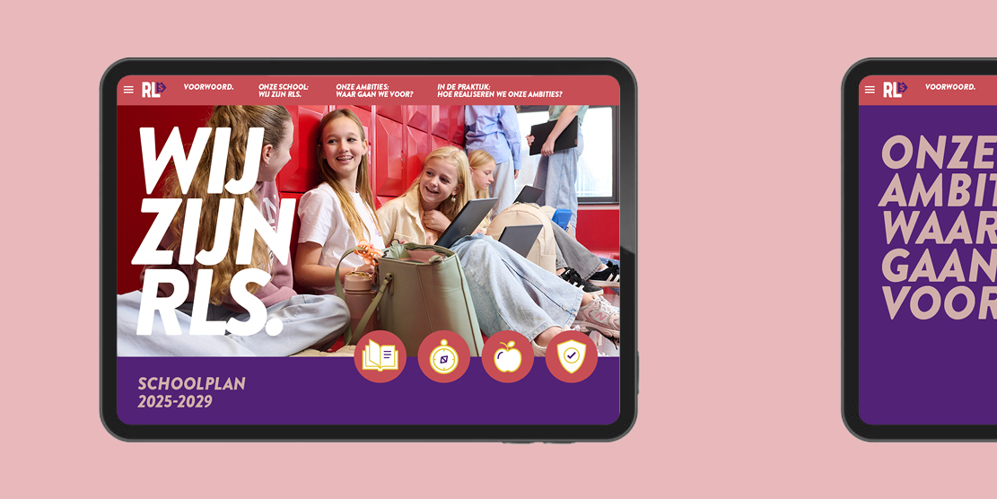Voor het ontwerp van het schoolplan kreeg ik de nieuwe huisstijl als basis mee. Vandaar uit heb ik het schoolplan met de strategie vormgegeven naar een overzichtelijk concept, waarin de vier ambities duidelijk naar voren komen en visueel met elkaar verbonden zijn.