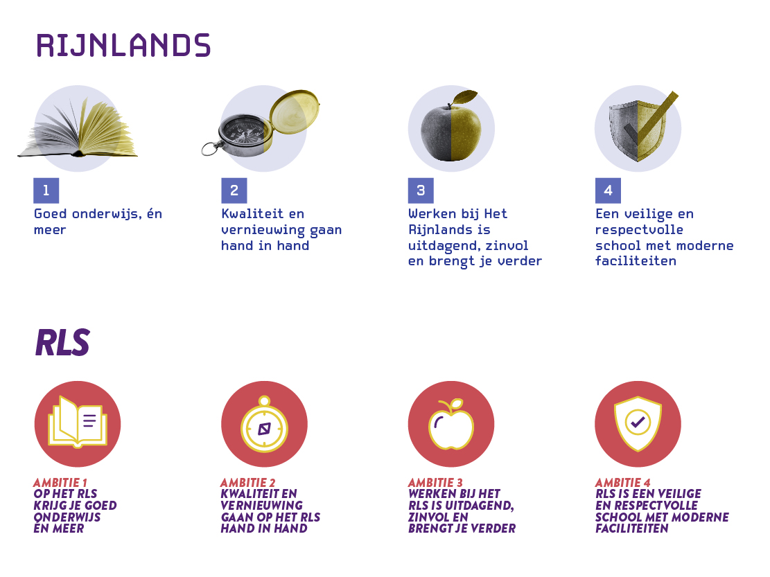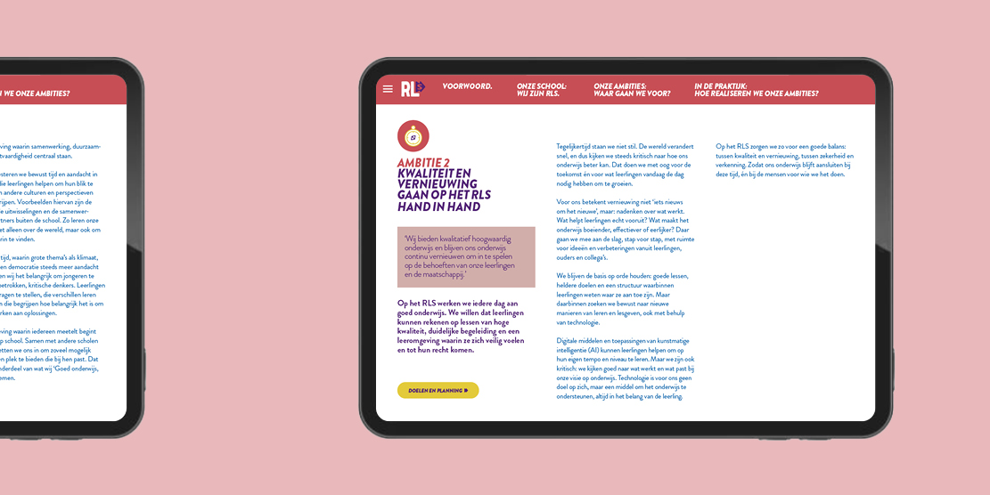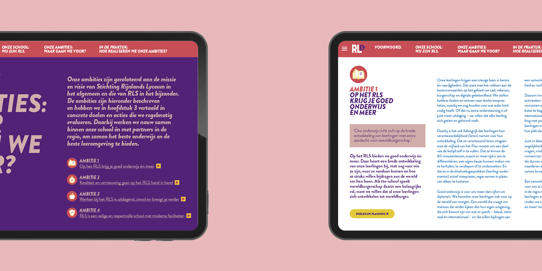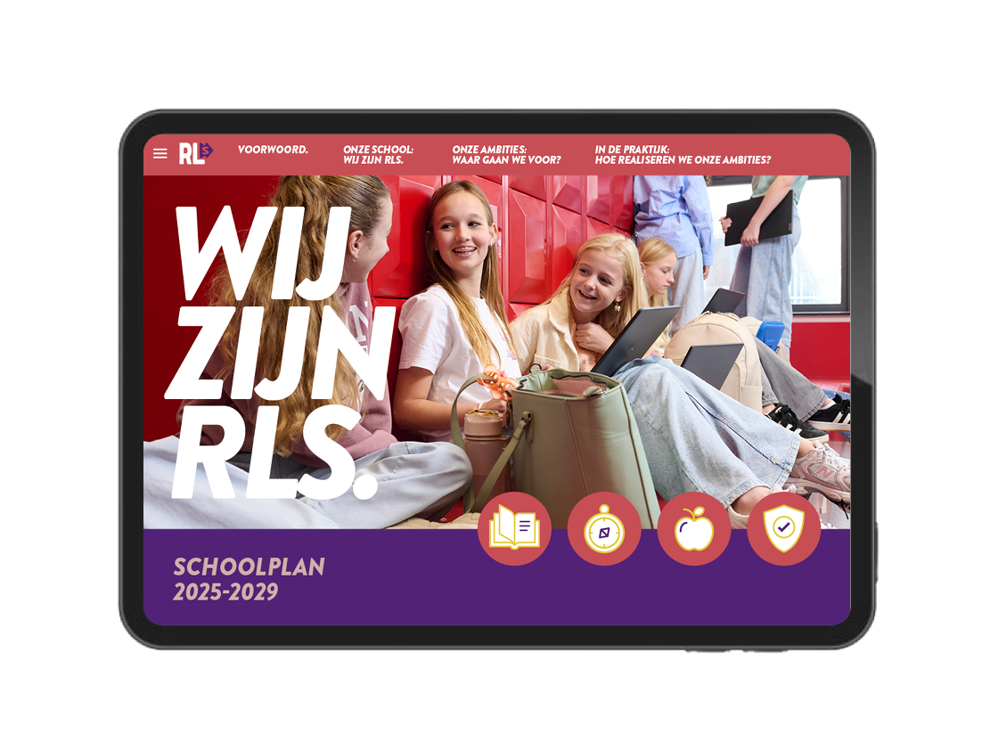 Voor het ontwerp van het schoolplan kreeg ik de nieuwe huisstijl als basis mee. Vandaar uit heb ik het schoolplan met de strategie vormgegeven naar een overzichtelijk concept, waarin de vier ambities duidelijk naar voren komen en visueel met elkaar verbonden zijn.