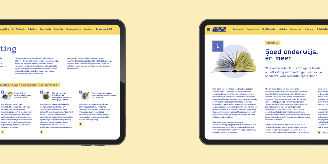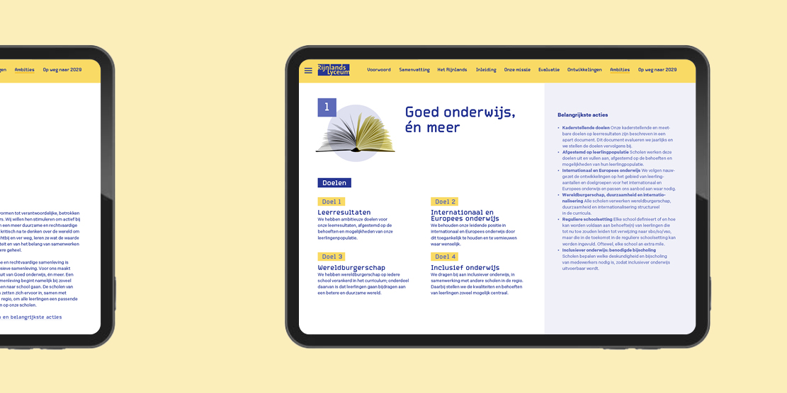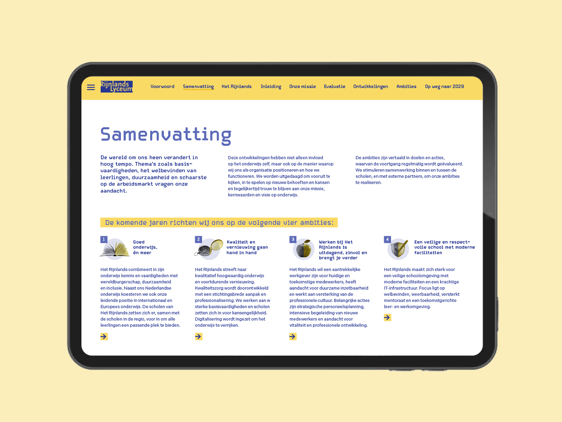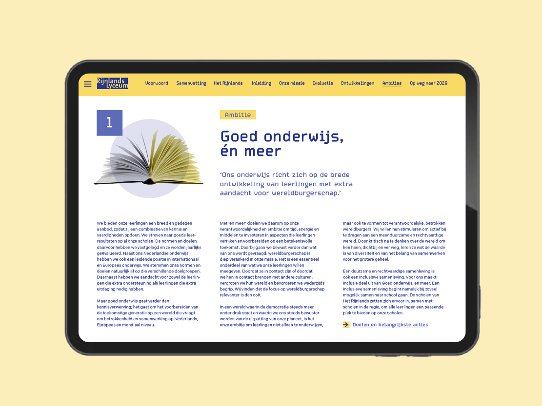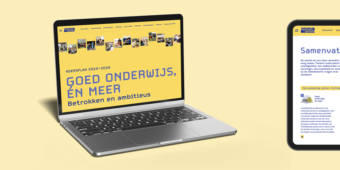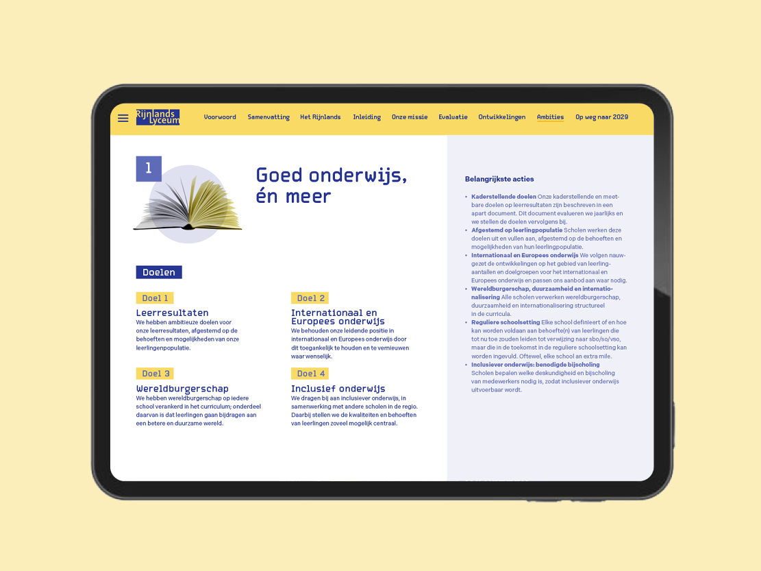 Het koersplan is vormgegeven als een interactieve pdf, waardoor je eenvoudig en snel kunt navigeren. Via duidelijke knoppen en links ga je direct naar de gewenste ambitie, doelen of acties. Dit maakt het document overzichtelijk en gebruiksvriendelijk. De interactieve opzet nodigt uit om te verkennen, onderdelen terug te vinden en verbanden te leggen, waardoor de inhoud beter tot zijn recht komt en makkelijker te gebruiken is in de praktijk.